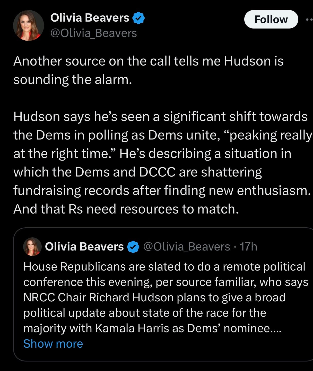 So we couldn’t find an actual story to link to here, probably because Beltway reporters think it’s their jobs to cover up for lunatic Republicans. But a Politico reporter tweeted yesterday that House Republicans were scheduled to have a remote political conference last evening and House Republican campaign chief Richard Hudson was “sounding the alarm.” “Hudson says he’s seen a significant shift towards the Dems in polling as Dems unite, ‘peaking really at the right time.’ He’s describing a situation in which the Dems and DCCC are shattering fundraising records after finding new enthusiasm. And that Rs need resources to match.” Politico sucks, but gosh that was fun to read.