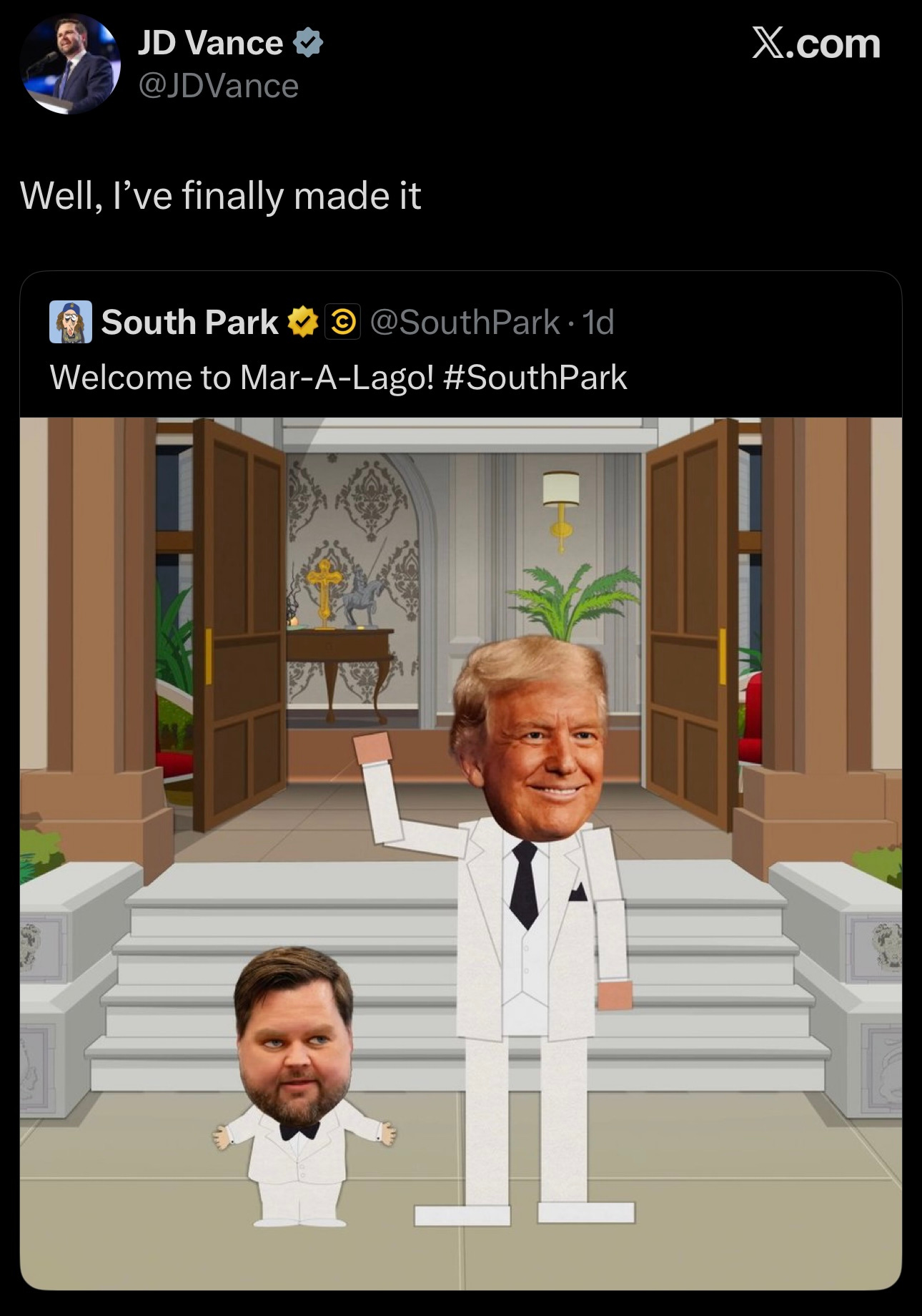 Poor Kristi Noem is now hiding behind her gender, saying the show shouldn’t make fun of the way women look (it’s apparently fine for Trump to do this, however). Trump is quietly seething that the whole world saw his teeny weenie. But our favorite is ol’ Jowls Dickface (JD) Vance pretending like he’s not mad…