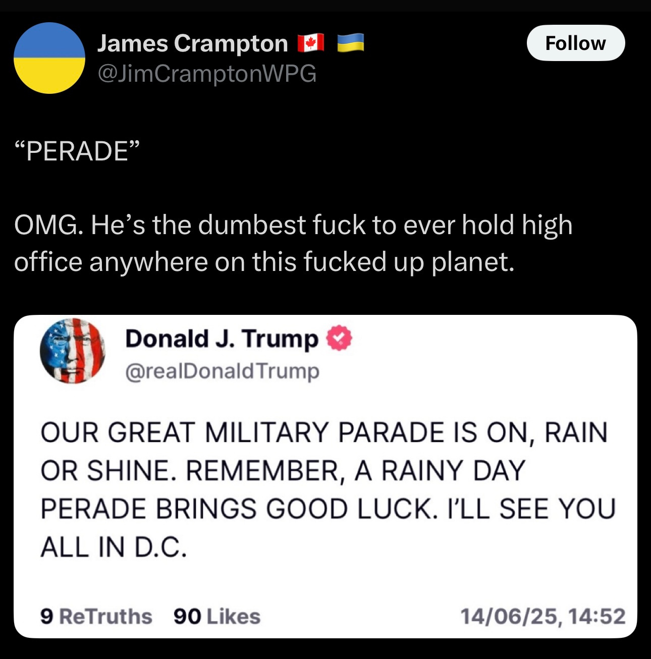 So while Trump is having his “perade” today — yeah, that’s what his dumb ass really wrote — we will be in the streets like millions of freedom-loving people around the world. We’re already seeing No Kings marches in other countries, and we love it.