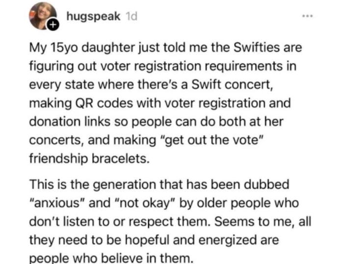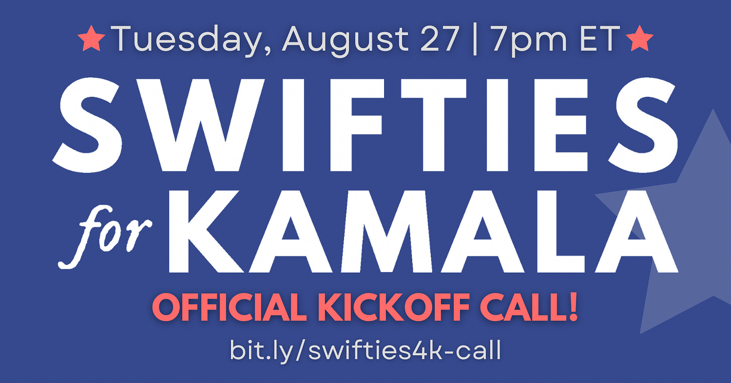 Swifties will convene on a call Tuesday, Aug 27 at 7pm ET to kick off efforts to organize for Harris. RSVP here and please share this post with all the Swifties you know.